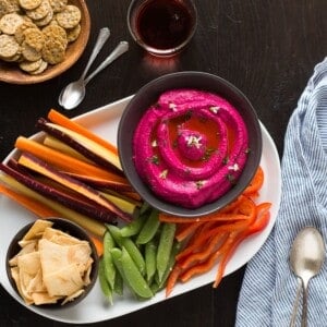 This Creamy Beet Hummusย with Yogurt will soon be your favorite way to eat your beets! ย Roasted beets, tahini and yogurt are blended together to make a creamy and healthy dip with a bright pink color that can’t be beet!