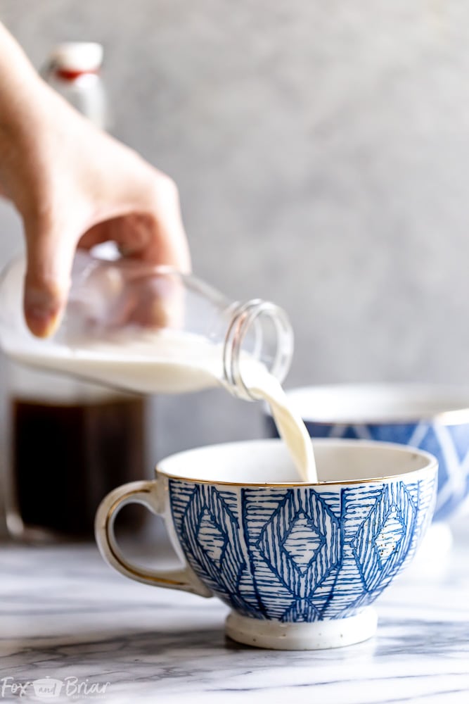 - Place milk into a microwave safe jar and heat for about 30 seconds, until warm. Tightly screw lid onto jar and shake for a few seconds, until milk is foamy.ย Use caution when unscrewing lid as pressure may build up.