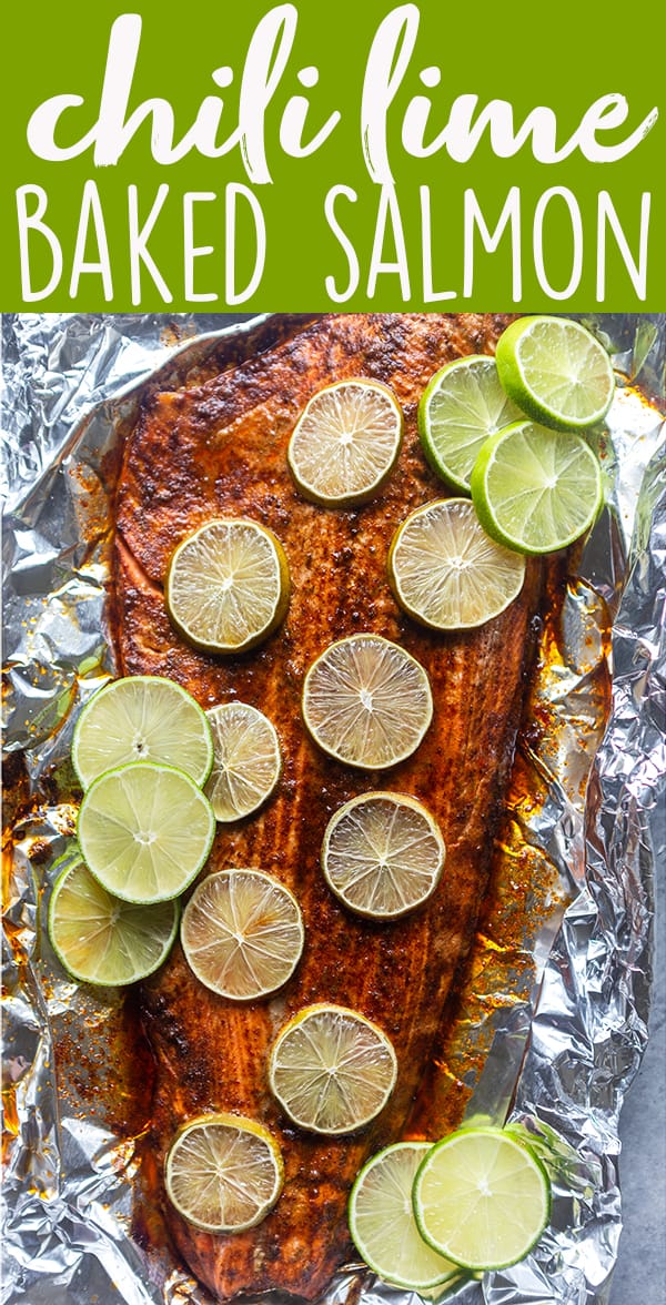Although salmon can be cooked many ways, including grilling it or pan frying it, my favorite way is to bake salmon in the oven.ย I often just make a simple roasted salmon with salt, pepper, olive oil and lemon.ย But sometimes I want to change it up, which is why I made this Chili Lime Baked Salmon!
