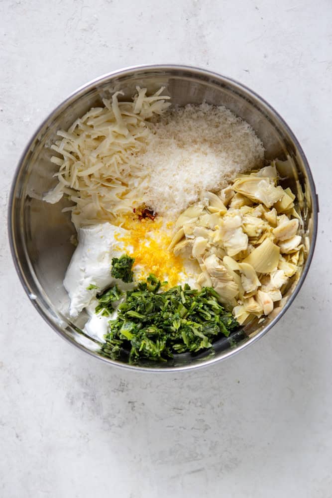 - In a large bowl, mix the cream cheese, sour cream and mayonnaise until combined. Stir in the mozzarella , parmesan, artichoke hearts, spinach, pepper flakes and lemon zest., mix until well combined.