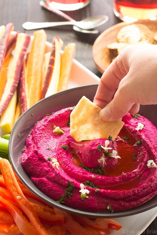 Look at that color!!! I love buying produce from local markets, especially now when all the good fruits and veggies are in season here in New Jersey. There’s actually this farm to table restaurant near my work that made an awesome beet gnocchi. I can’t get over how pretty this hummus looks!!