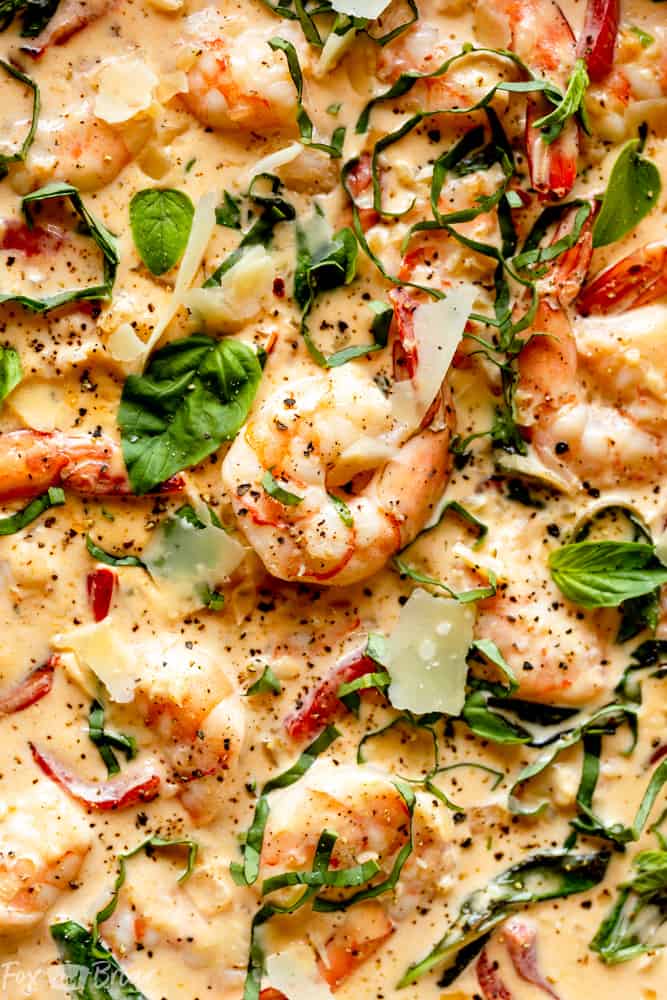 This Creamy Parmesan Basil Shrimp is a restaurant quality dish you can make at home!ย Creamy luscious sauce envelops plump shrimp, perfect for serving over pasta, or make it keto and serve with spaghetti squash instead!