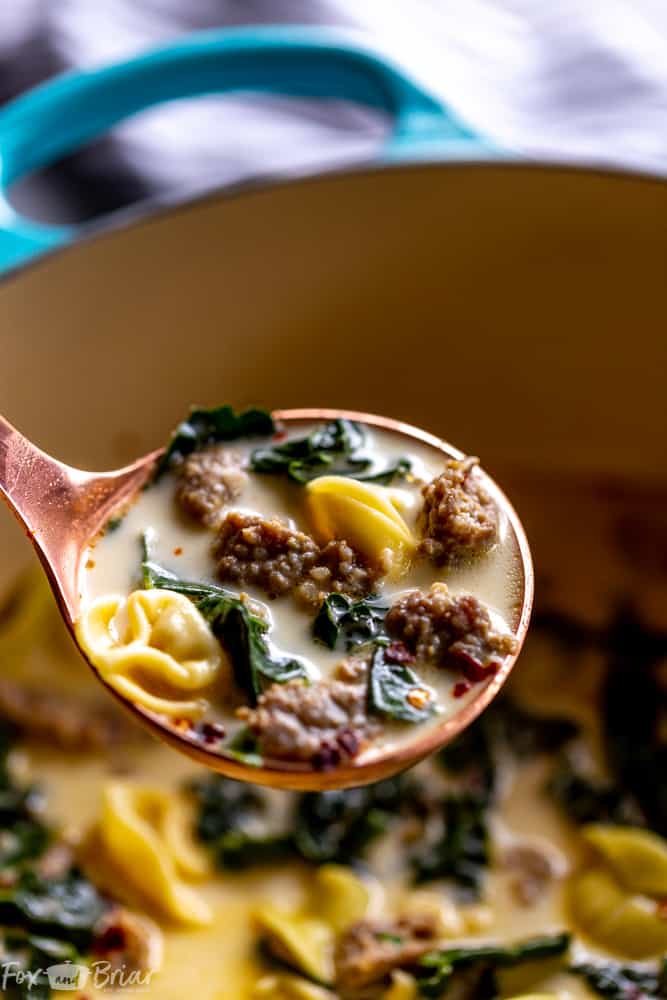 Hello friends! It’s Monday (again!?!), and you know what that means.ย It’s time for an easy dinner recipe.ย I’m so excited to share this Five Ingredient Creamy Sausage and Tortellini Soup with you today!ย If you are a fan of the famous Zuppa Toscana at the Olive Garden, you will LOVE this soup!ย It’s a twist on Zuppa Toscana, but with tortellini instead of potatoes.ย Because pasta is always a good idea.