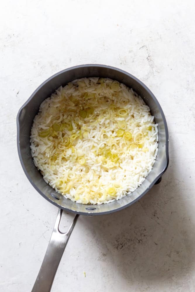 - When oil is hot, add the ginger, garlic and white part of scallions. Sautรฉ for a about a minute, until fragrant. Add the rice and stir until rice is coated with oil and fully mixed with aromatics.