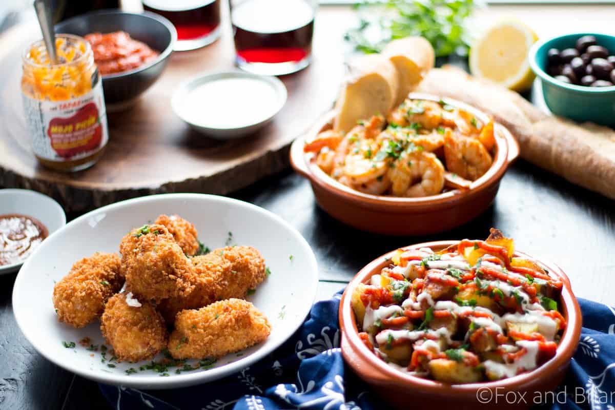 With my nostalgia for Spain fully awakened, I was inspired to make quite a few tapas that I will be sharing in the next few weeks. Fred Meyer was kind enough to send me a box of Spanish goodies to play with while developing a recipe for them. Great Spanish olive oil, tapas sauces, olives and more. They will all be available in the stores starting April 3rd, so get excited! The line will be available in ALL Kroger stores, so even if you don’t live near a Fred Meyer, if you live near any Kroger owned store you will be able to check it out. Also aren’t those classic terra-cotta cazuela dishes cute? Just like how tapas are served in Spain. Those are actually imported from Spain, and I got them at Fred Meyer too!