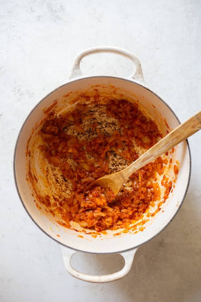 - Heat oil in a dutch oven over medium heat. Add the onions, season with salt and sauté for about 20 minutes – until soft and golden.