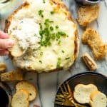 Transfer the dip to the bread bowl. Top with the remaining 1/2 cup shredded mozzarella.