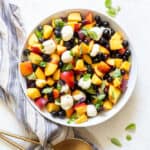 To make ahead - do not add basil and dressing until ready to serve. Whisk together dressing, set aside. Toss together fruit and cheese, keep in the fridge until ready to serve. Just before serving, chop basil and add to salad, then toss with dressing and serve. Salad is best served the day it is made.