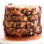 Pour the bread batter into the prepared pan. Sprinkle remining 1/4 cup of chocolate chips on top. Bake for 55 minutes or until a toothpick inserted into the bread comes out with just a few crumbs.