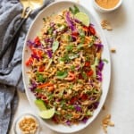 When ready to serve, add pasta to a large bowl, followed by chopped vegetables and peanut sauce. Toss everything together until well combined. Serve garnished with chopped fresh basil and sesame seeds if desired.
