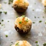 Top each mushroom with panko bread crumbs. The easiest way to do this is to hold the mushroom over the breadcrumb bowl and use a spoon to sprinkle the breadcrumbs on top, allowing the excess to fall back into the bowl.