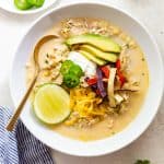 Return chicken to slow cooker along with frozen corn and half and half, cook for about 5 more minutes, or until corn and chicken are warm. Stir well and serve with desired toppings.