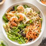 To put together the salad, separate the lettuce into individual serving bowls, top with rice noodles, shrimp, cucumber, carrot, green onions, drizzle with peanut dressing, and top with the basil and mint chiffonade. Garnish with black sesame seeds if desired.