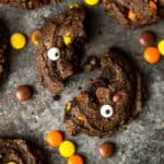 These Double Double Chocolate Peanut Butter Cookies are doubly good! Dark chocolate and peanut butter cookies with chocolate chips and peanut butter candies! Add candy eyes if you want to make these cookies spooky for Halloween, but they are delicious all year long.