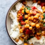 Add spices and the chickpeas, and season with salt and pepper. Stir until fully combined. Add tomatoes including juice, stir until fully combines, scraping up and bits from the bottom of the pan.