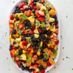 Wash and prepare all fruit. Right before serving, add to a large bowl and pour dressing over fruit. gently toss to combine, garnish with fresh mint.