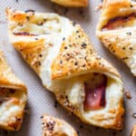 Fold one corner over the ham and cheese, then the opposite corner over. You can dip your finger in a little water and use that as “glue” to seal the corners together. Brush puff pastry with egg wash. Sprinkle with everything bagel seasoning (or use flaky salt and pepper if not using the everything seasoning)