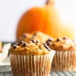 Portion out the batter evenly between the 12 muffin wells. I use an ice cream scoop to make this easy. Sprinkle a few chocolate chips on top of each muffin.