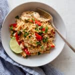 Add the cooked noodles and peanut sauce. Toss until everything is mixed and coated with sauce. If peanut sauce is too thick, stir in a few tablespoons of the reserved pasta water at a time until sauce is at desired consistency. Top with chopped peanuts and cilantro and serve.