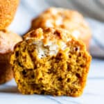 Fill each muffin cup halfway with pumpkin batter. Use a spoon to make an indentation in the center of each muffin. Spoon about 1-1.5 tablespoons of cream cheese filling into the indentation. Top off with remaining pumpkin batter, so that each muffin cup is nearly full.