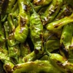 When the skillet is very hot, carefully remove from the oven and pour the peppers into the skillet. Put the skillet back into the oven and allow the peppers to roast without moving them for about three minutes. When they have started to take on a nice char, stir the peppers. Continue cooking and stiring about every one to two minutes until they are blistered, for a total cooking time of about six minutes.