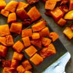Roast in the oven for about 15 minutes. Use a metal spatula to turn the squash, then roast for an additional 10-20 minutes, or until squash is tender and starting to turn golden..
