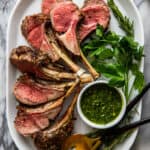 1 rack usually has 7-8 bones. Plan on 2-4 chops per person. Increase number of racks depending on how many servings you need.