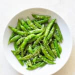 In a medium sauté pan over medium heat, add the snap peas, water and sesame oil. Cover and steam for 5 minutes, tossing until water evaporates.