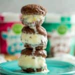 These Skinny Brownie Bite Ice Cream Sandwiches are a bite sized treat that won't break your calorie budget. They use luscious low calorie ice cream and low fat mini brownie bites, but you won't even be able to tell they are low in calories!