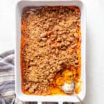 To make ahead of time: Can be made 1-2 days ahead of time. Prepare the sweet potato filling as instructed and transfer to casserole dish but don't bake. Cover with plastic wrap and refrigerate until ready to bake. You can also make the pecan streusel topping ahead of time, but keep it sealed in a separate container and don't sprinkle it over the top of the sweet potatoes until ready to bake.To store: Cool completely before covering. Store in an airtight container in the fridge for up to 3 days.